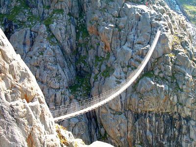 Dit is een hangbrug, het gewicht van de wandelaars wordt via de touwen naar de (in dit geval) rotswand geleid.