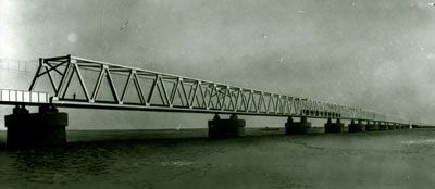 Dit is een pijlerbrug, een wat stevigere brug. Het wegdek wordt gedragen door de pijlers in het water.